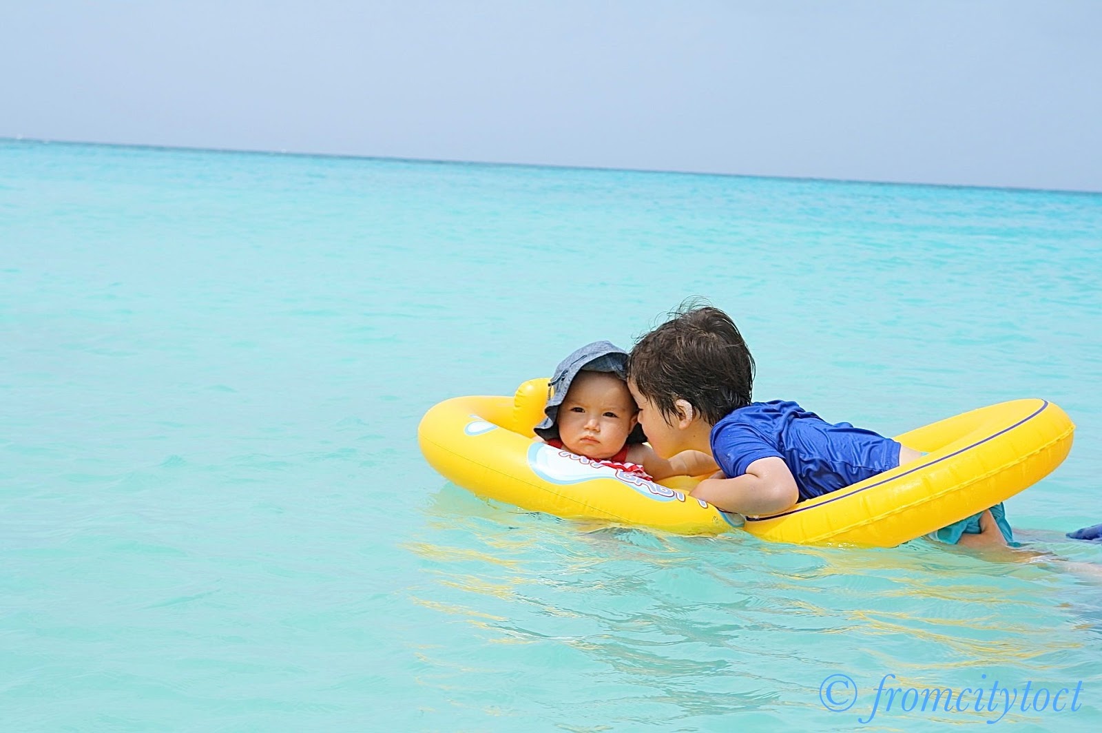 再び海でプカプカ。ちなみに↑の黄色い浮き輪は買って持って行ったのですが、大正解。小さい子連れでビーチバケーションの予定がある方にはおススメです。Nの浮き輪は足を入れてサポートするタイプの物で、Kのは普通の浮き輪。この浮き輪があったから私たちも海に浸かりながらもか〜なり楽でした。